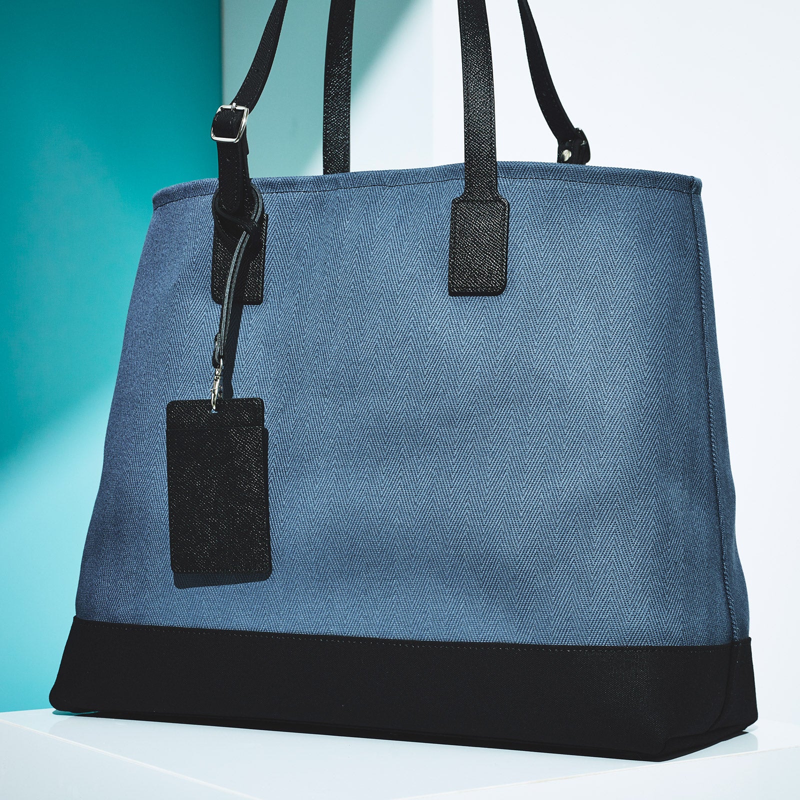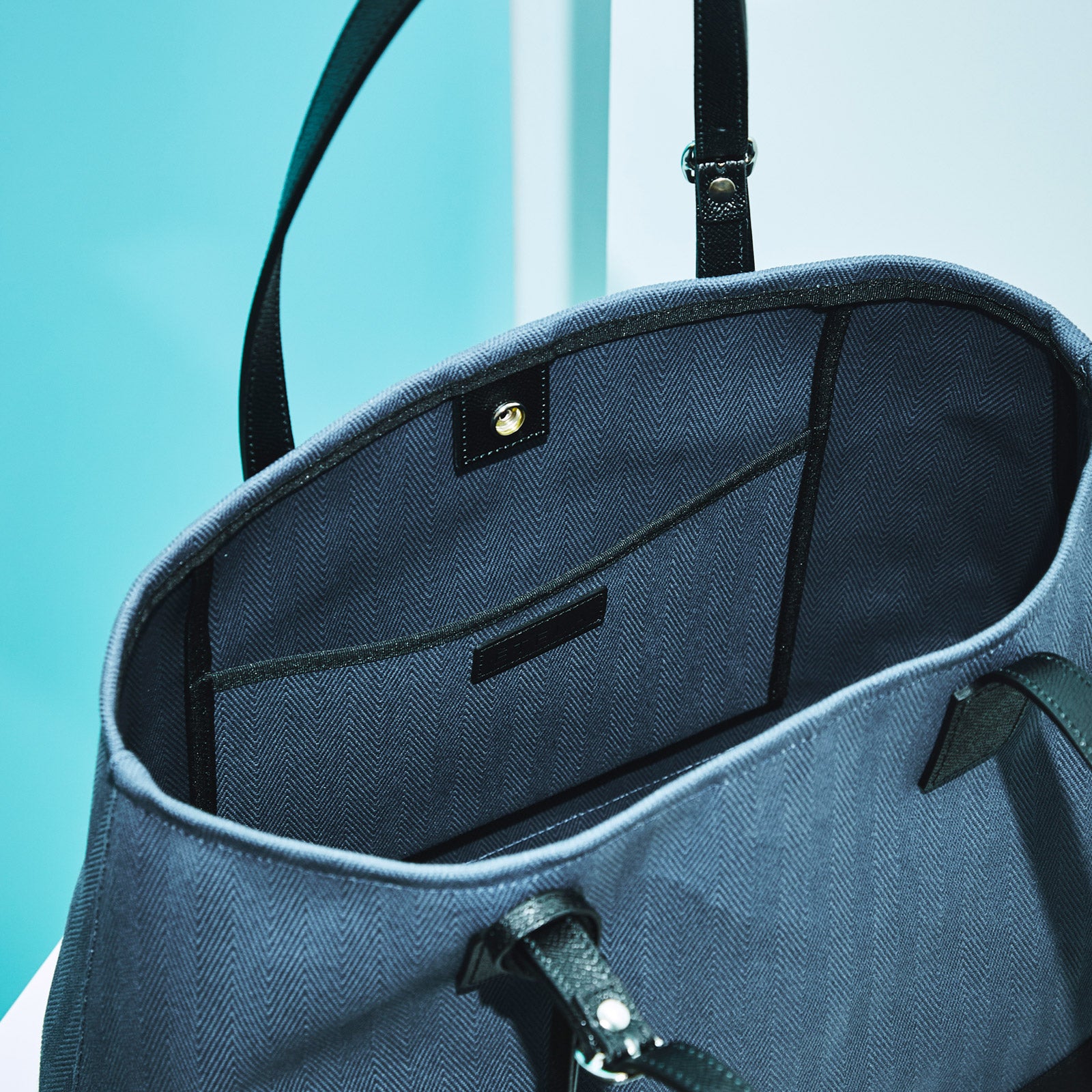 ジャケットパンツスタイルのようなオンスタイルから上品なオフスタイルまで幅広く持ち回せる無地のトートバッグ。生地のベースには、130年の歴史を持つ伝統的なシャトル織機によっ織り上げられた精緻なヘリンボーンを使用しています。さらに、生地にハリを持たせる加工により、通常のキャンバス商材では出せないクリーンな見た目を表現。