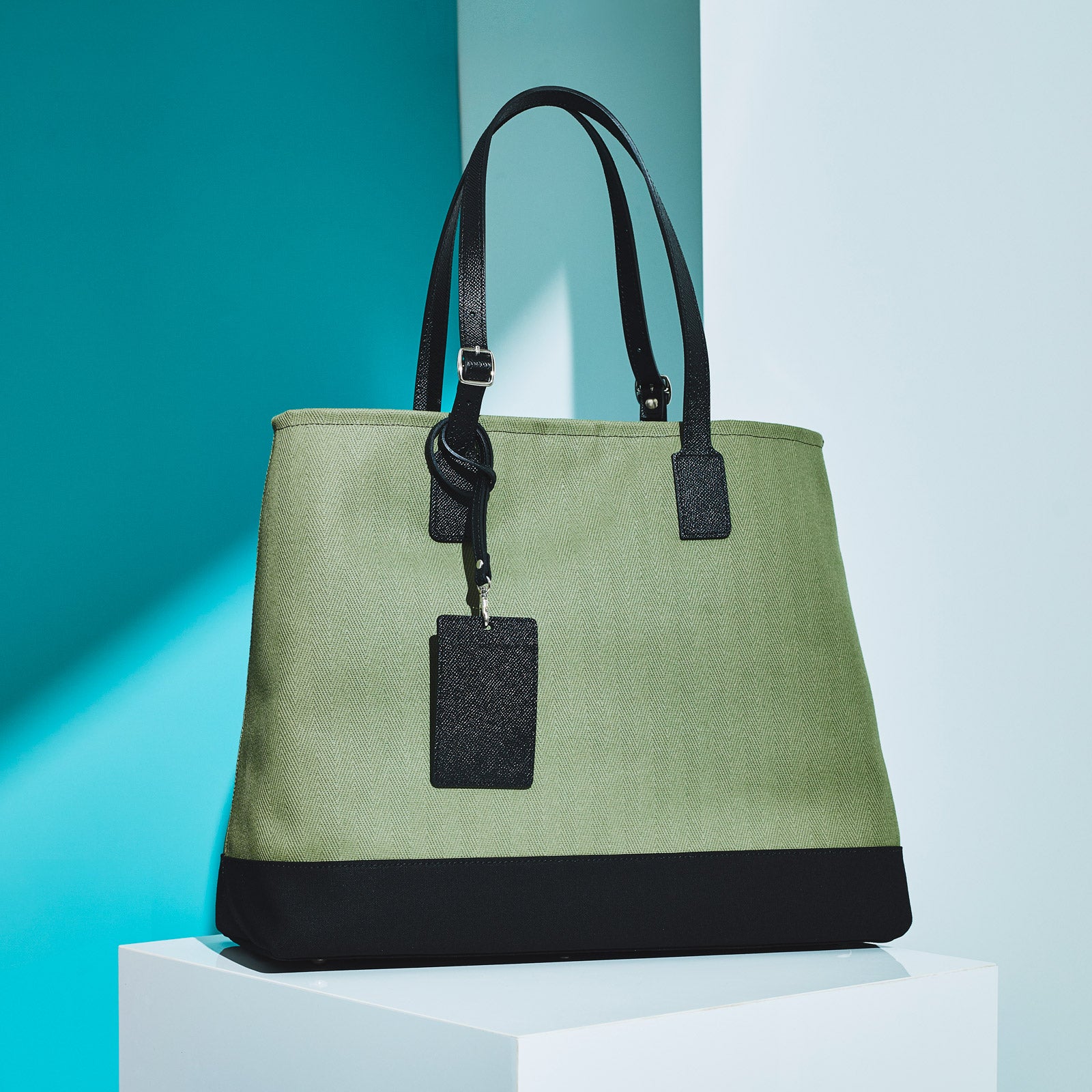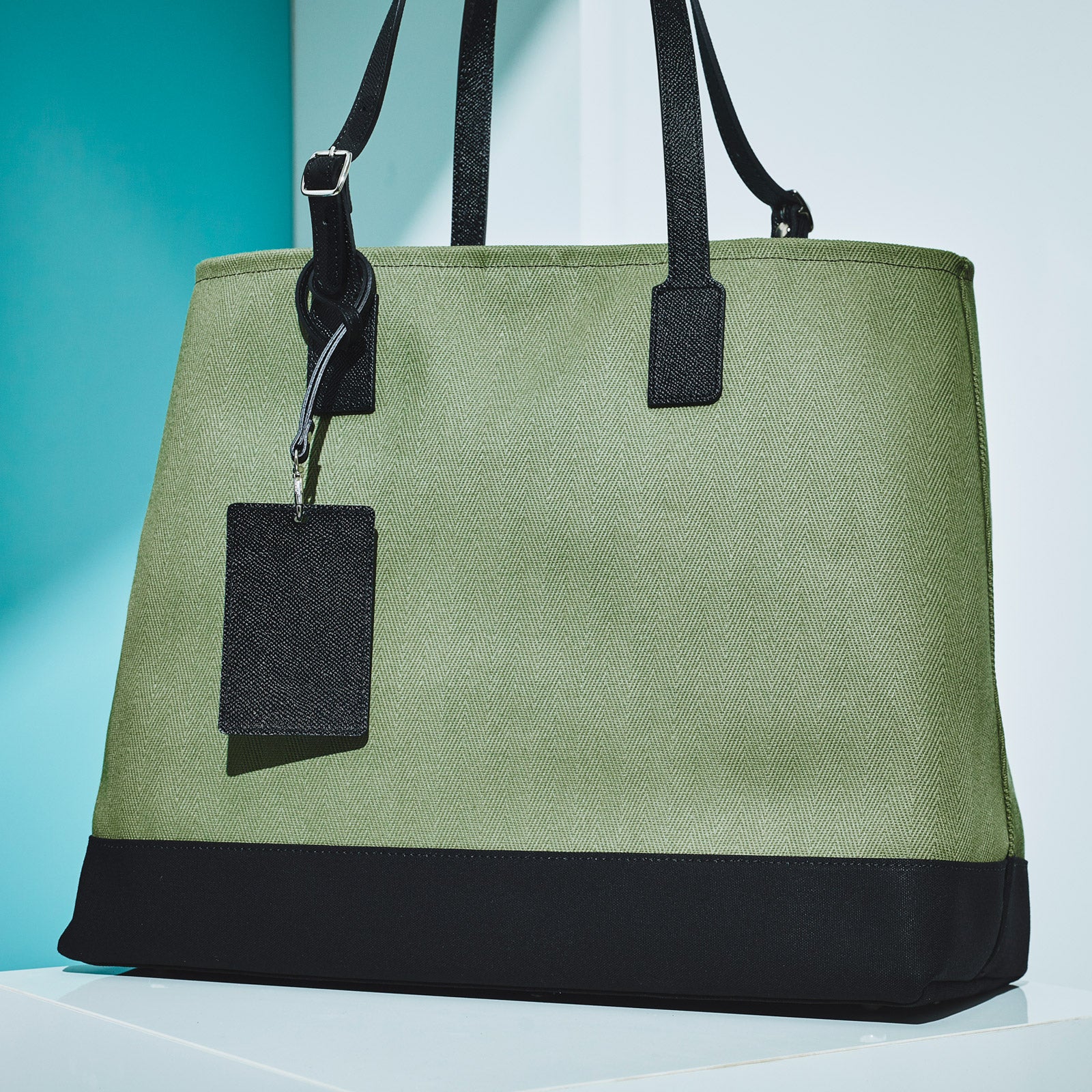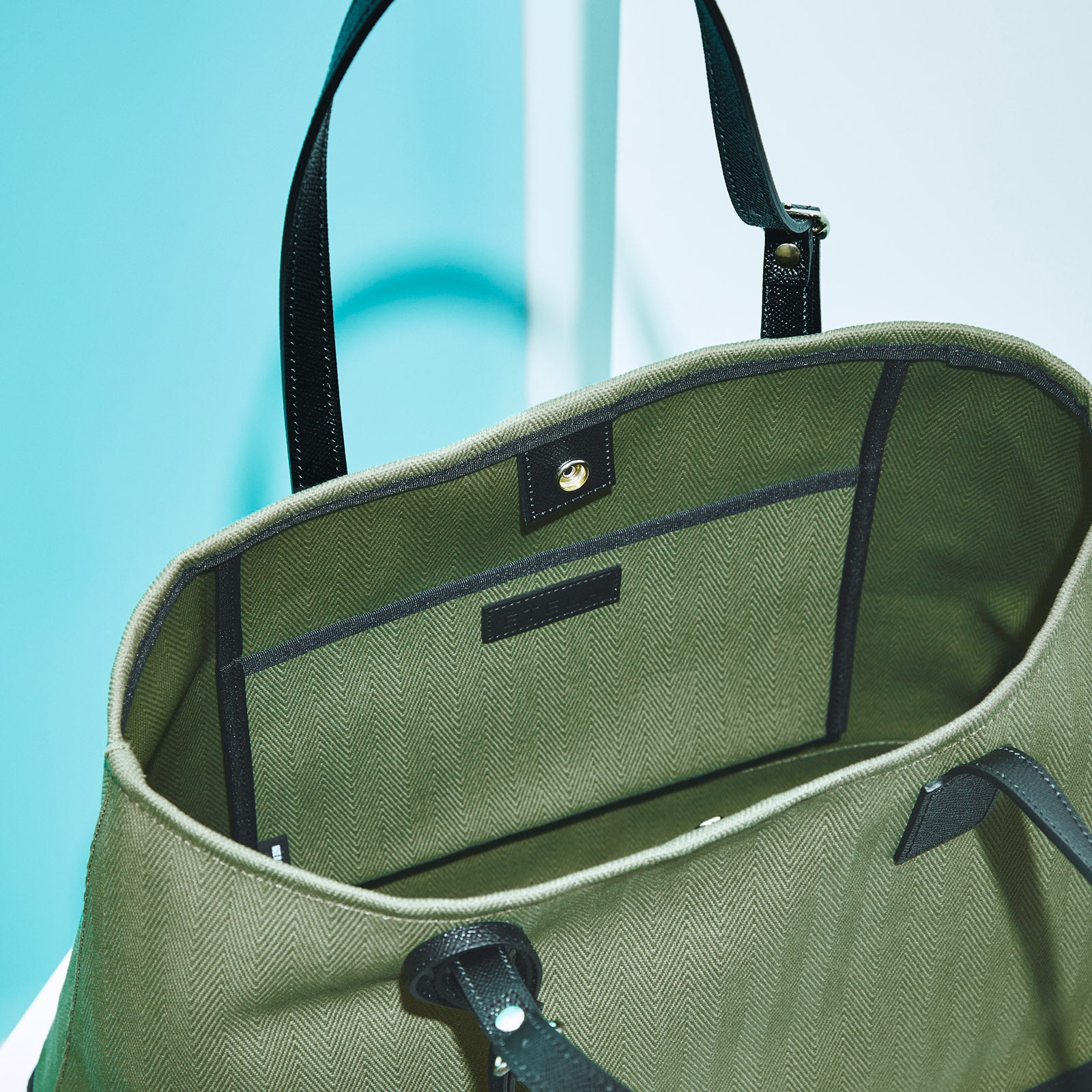 ジャケットパンツスタイルのようなオンスタイルから上品なオフスタイルまで幅広く持ち回せる無地のトートバッグ。生地のベースには、130年の歴史を持つ伝統的なシャトル織機によっ織り上げられた精緻なヘリンボーンを使用しています。さらに、生地にハリを持たせる加工により、通常のキャンバス商材では出せないクリーンな見た目を表現。