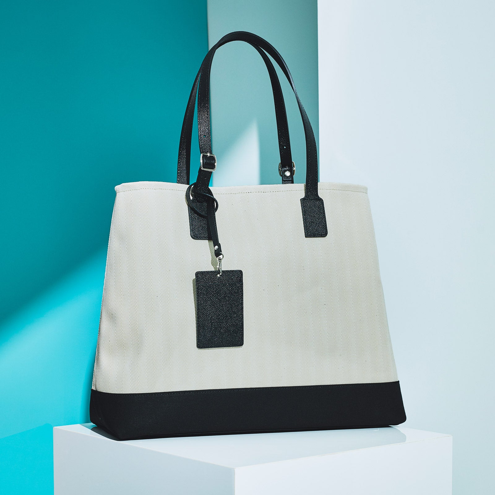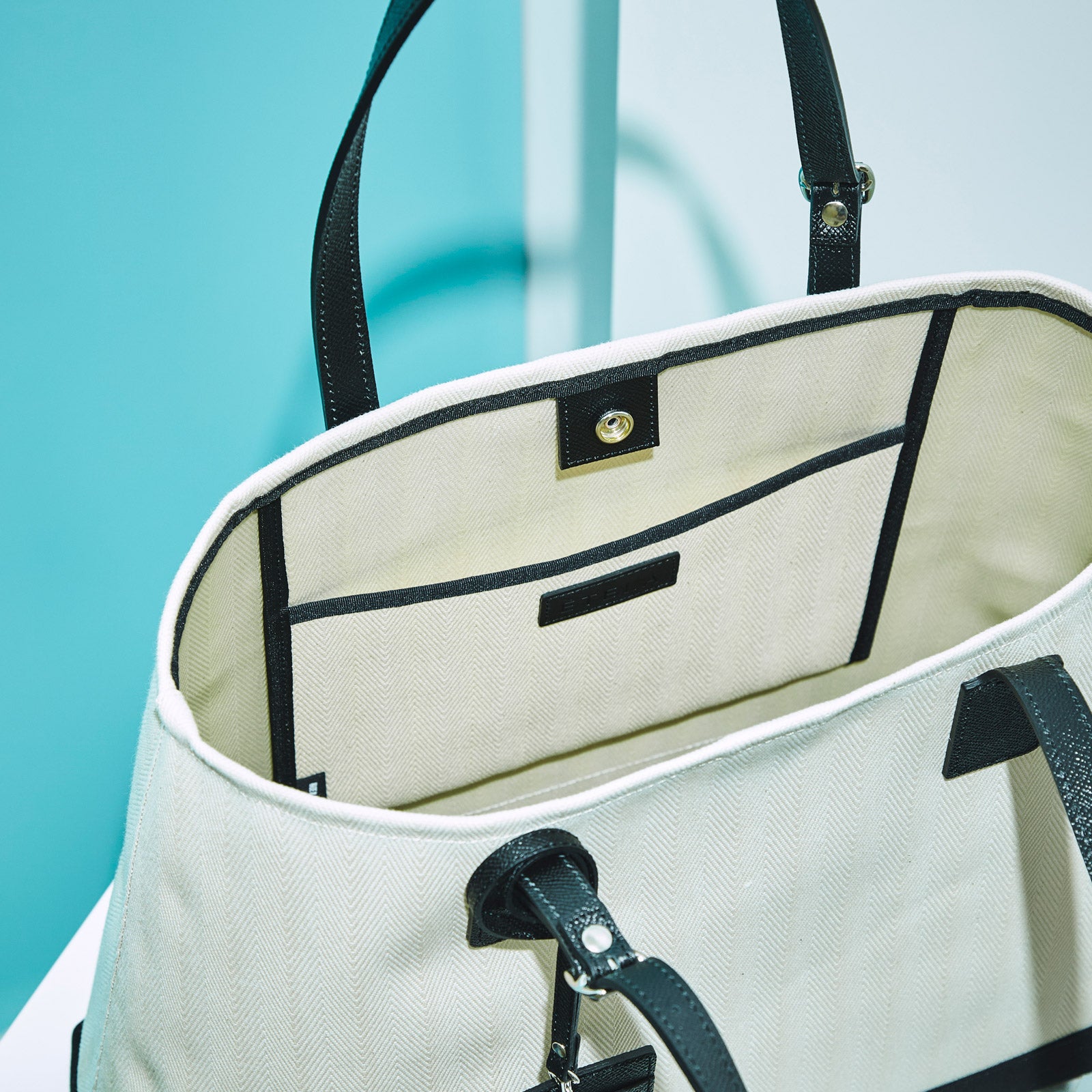 ジャケットパンツスタイルのようなオンスタイルから上品なオフスタイルまで幅広く持ち回せる無地のトートバッグ。生地のベースには、130年の歴史を持つ伝統的なシャトル織機によっ織り上げられた精緻なヘリンボーンを使用しています。さらに、生地にハリを持たせる加工により、通常のキャンバス商材では出せないクリーンな見た目を表現。