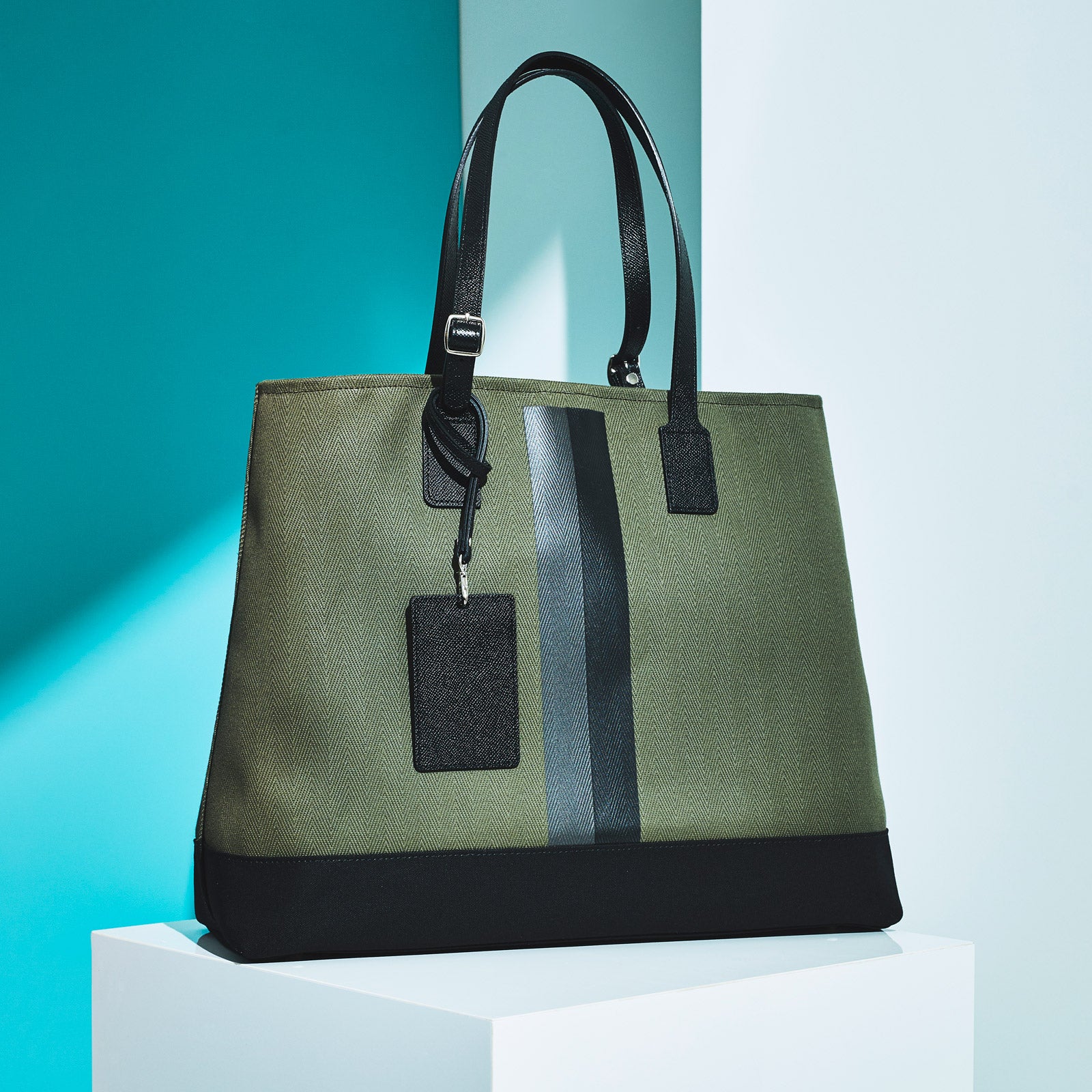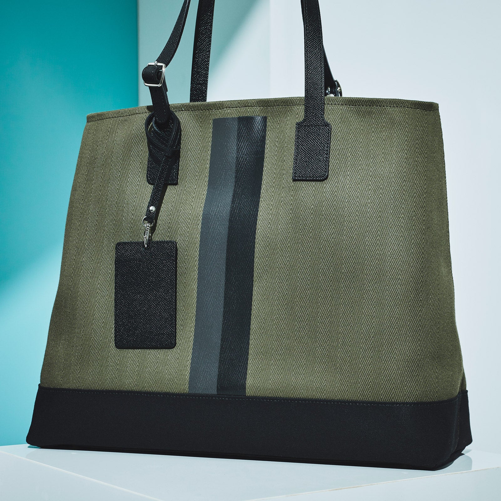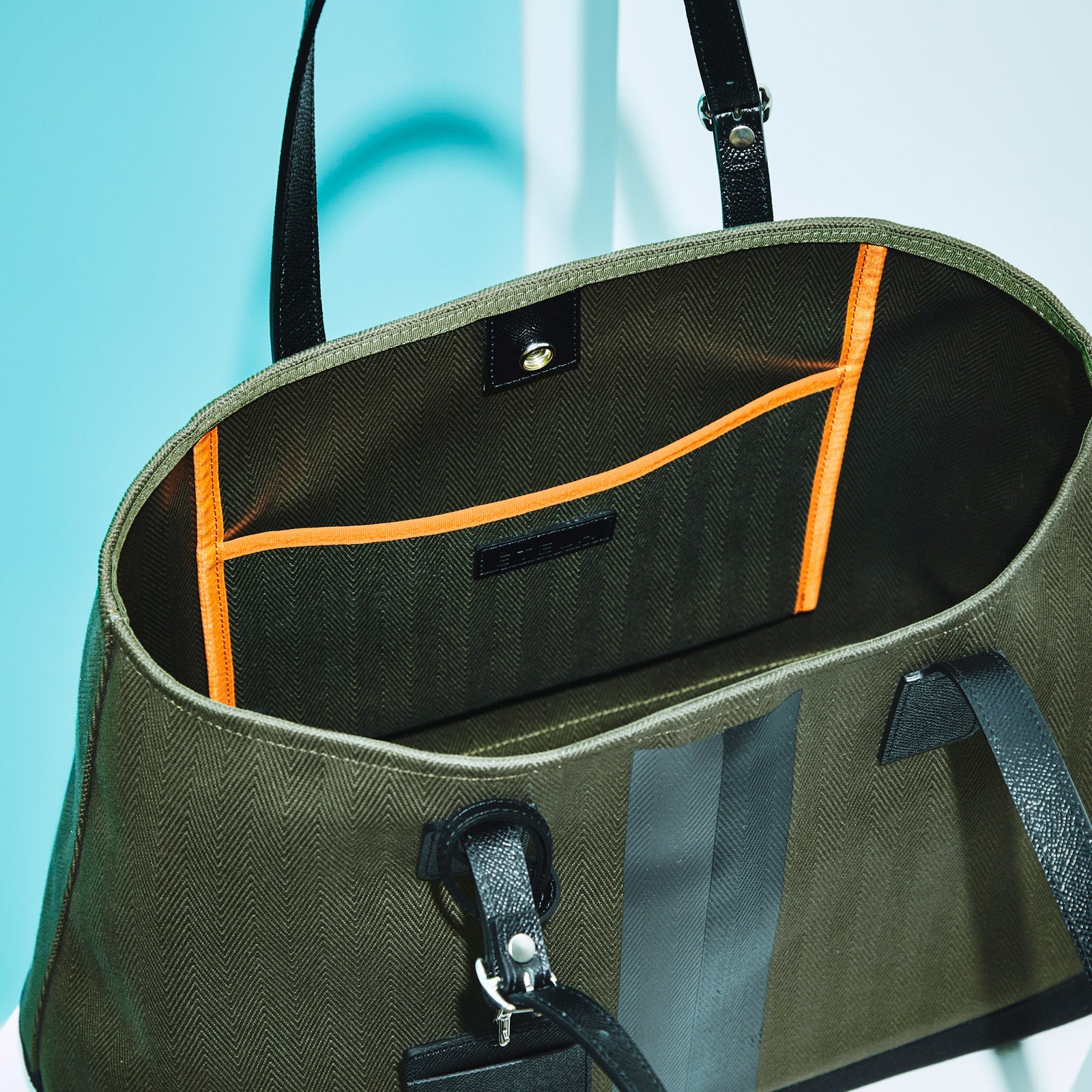 ジャケットパンツスタイルのようなオンスタイルから上品なオフスタイルまで幅広く持ち回せるトートバッグ。表面にはシルクスクリーンによる発色の良いプリントが中央に2トーンラインを施されており、ファッション的にも一層アクセントとなるモデルとなっています。生地のベースには、130年の歴史を持つ伝統的なシャトル織機によっ織り上げられた精緻なヘリンボーンを使用しています。さらに、生地にハリを持たせる加工により、通常のキャンバス商材では出せないクリーンな見た目を表現。