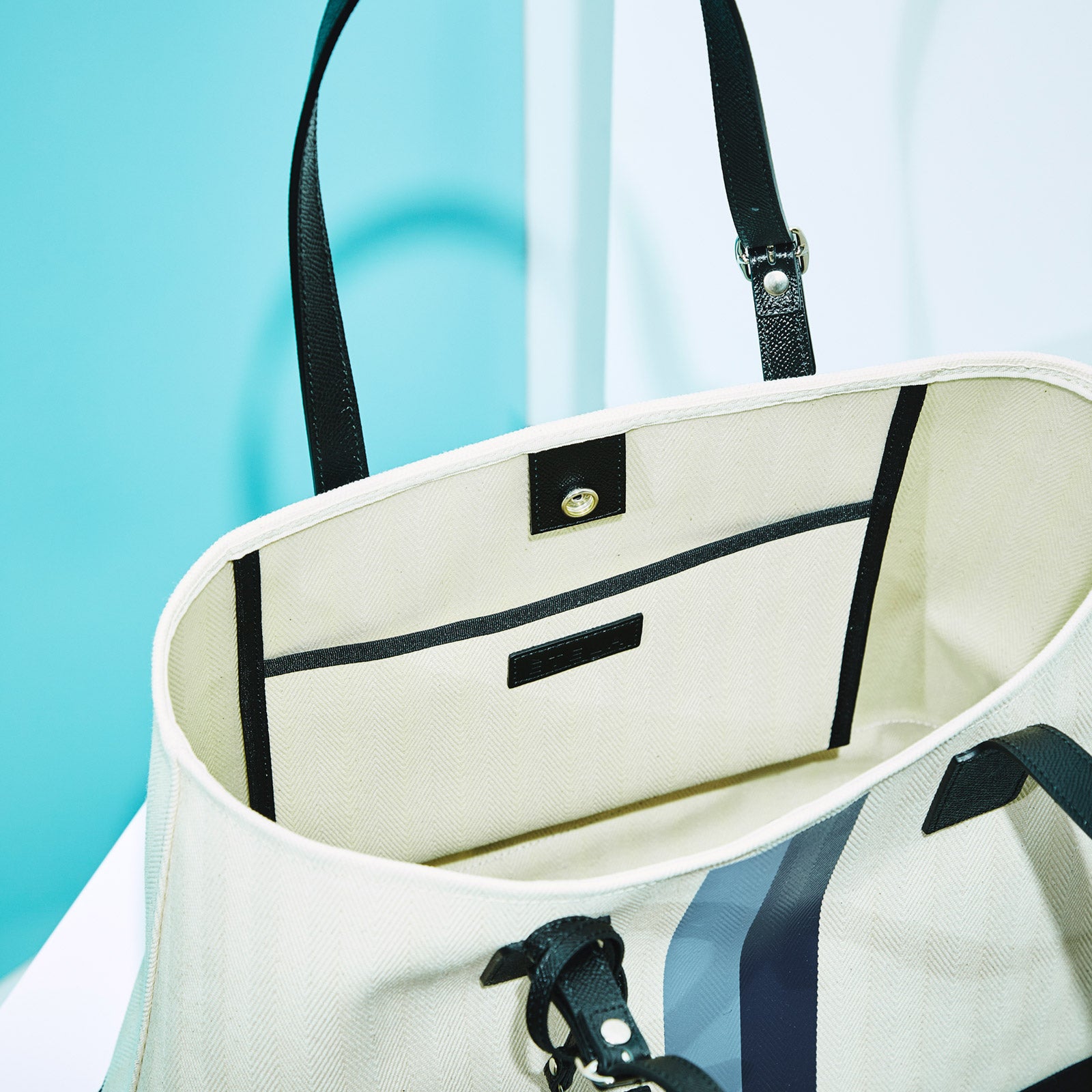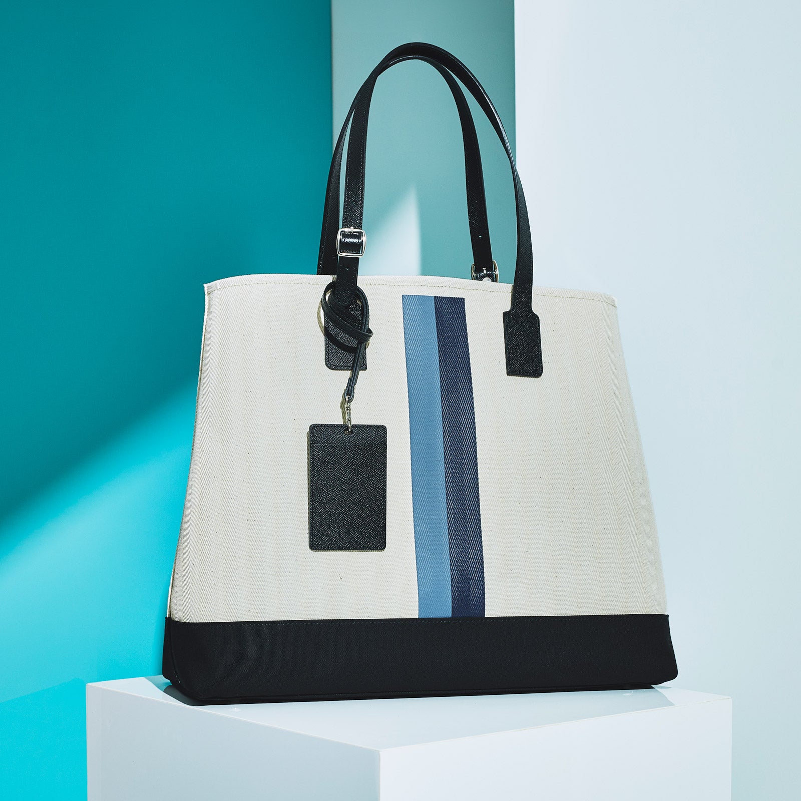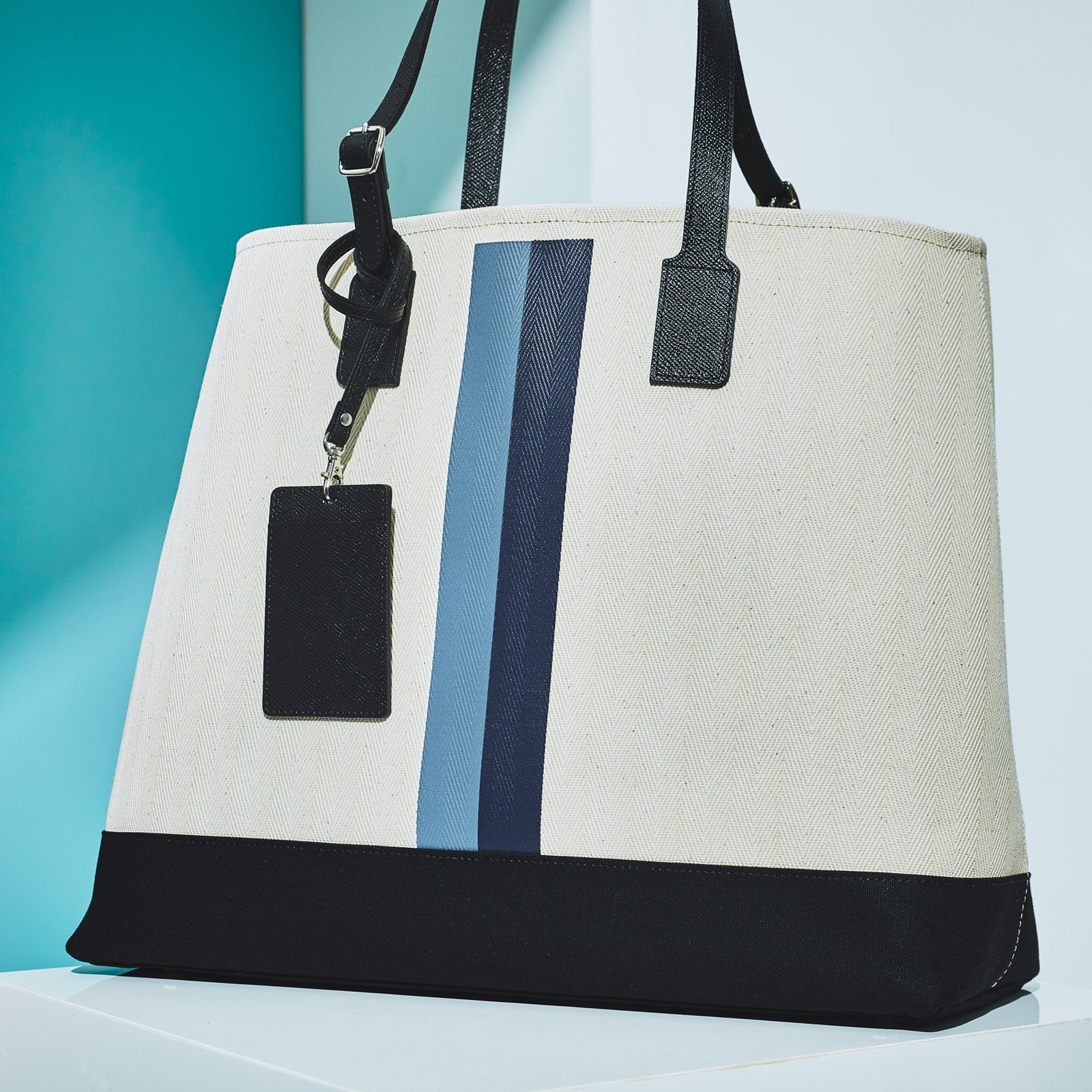 ジャケットパンツスタイルのようなオンスタイルから上品なオフスタイルまで幅広く持ち回せるトートバッグ。表面にはシルクスクリーンによる発色の良いプリントが中央に2トーンラインを施されており、ファッション的にも一層アクセントとなるモデルとなっています。生地のベースには、130年の歴史を持つ伝統的なシャトル織機によっ織り上げられた精緻なヘリンボーンを使用しています。さらに、生地にハリを持たせる加工により、通常のキャンバス商材では出せないクリーンな見た目を表現。