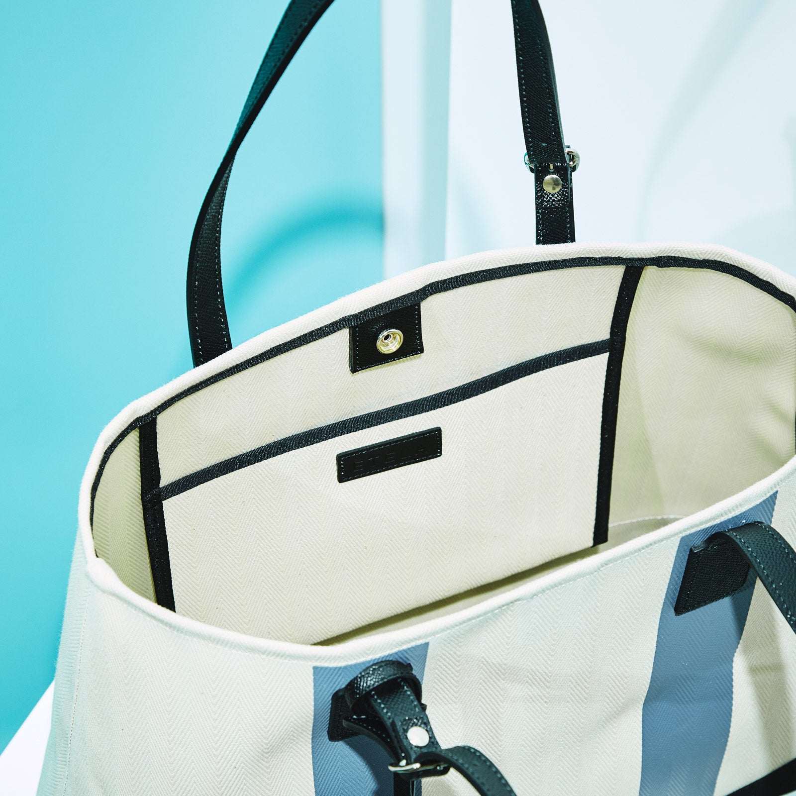ジャケットパンツスタイルのようなオンスタイルから上品なオフスタイルまで幅広く持ち回せるトートバッグ。表面にはシルクスクリーンによる発色の良いプリントが持ち手の延長線上に2ライン施されており、ファッション的にも一層アクセントとなるモデルとなっています。生地のベースには、130年の歴史を持つ伝統的なシャトル織機によっ織り上げられた精緻なヘリンボーンを使用しています。さらに、生地にハリを持たせる加工により、通常のキャンバス商材では出せないクリーンな見た目を表現。