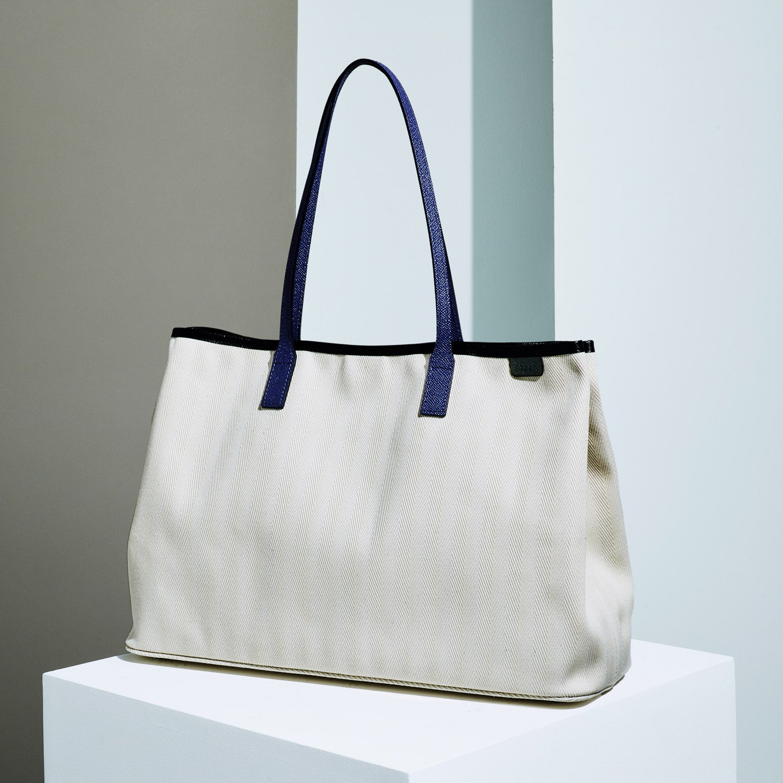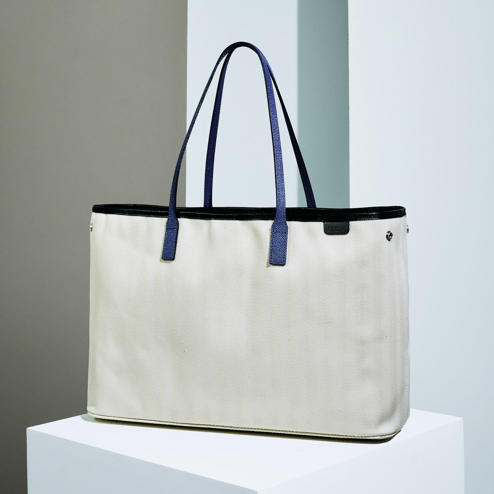 カジュアルになりがちな春から夏にかけての軽めのスタイルに、このトートバッグを加えることでエレガントな雰囲気をキープしていただけます。またサイドにあるスナップボタンを閉じればバッグ全体のフォルムも変化し、スタイルによって使い分けることができます。