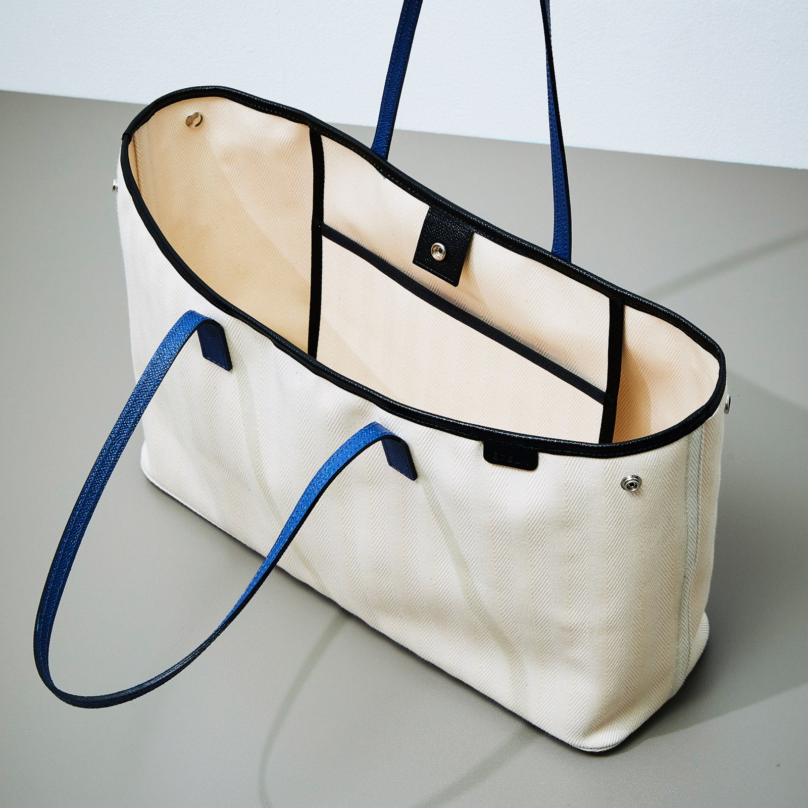生地のベースには、130年の歴史を持つ伝統的なシャトル織機によっ織り上げられた精緻なヘリンボーンを使用しています。さらに、生地にハリを持たせる加工により、通常のキャンバス商材では出せないクリーンな見た目を表現。
