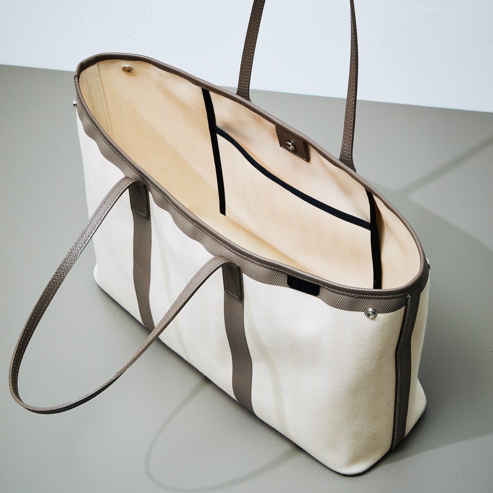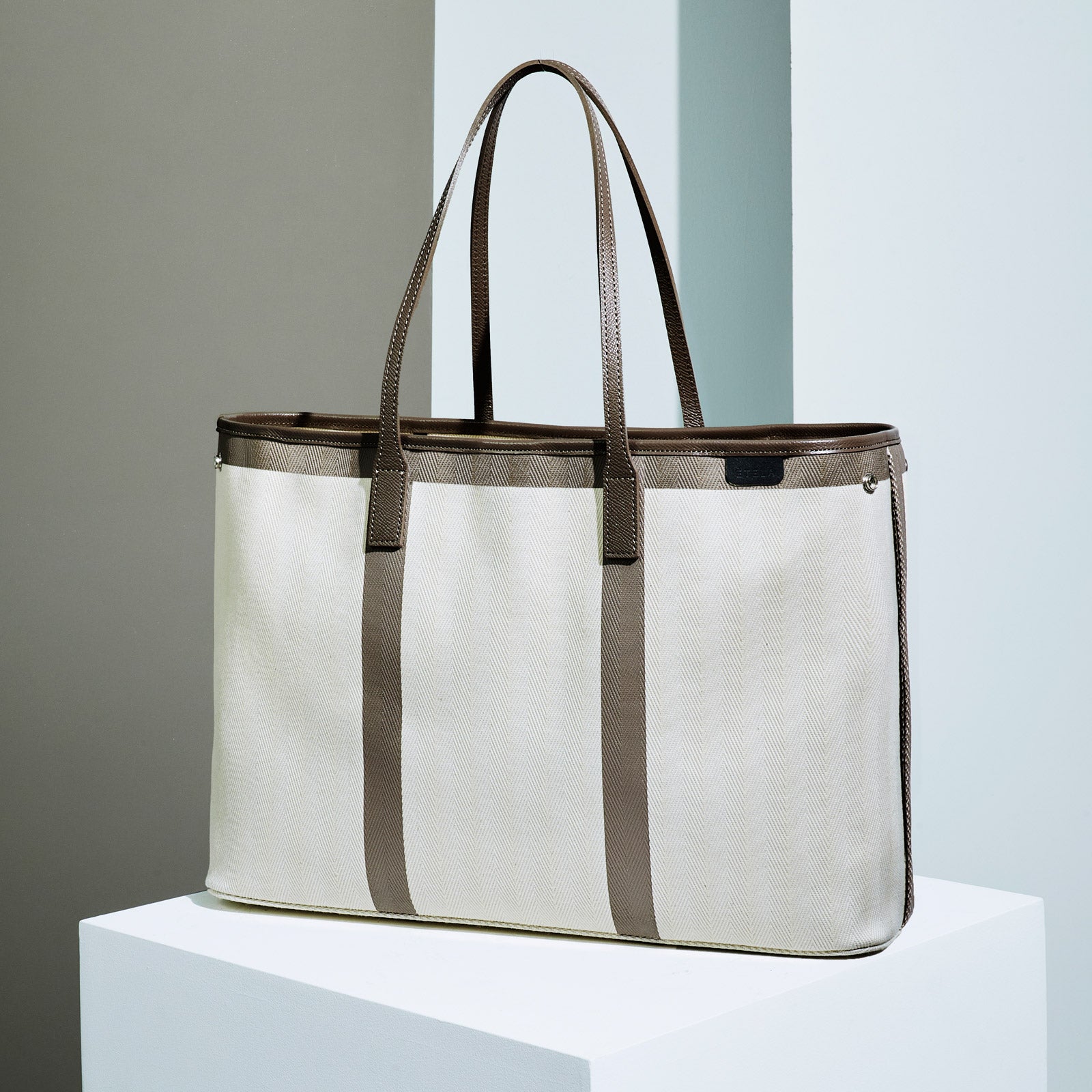 生地のベースには、130年の歴史を持つ伝統的なシャトル織機によっ織り上げられた精緻なヘリンボーンを使用しています。さらに、生地にハリを持たせる加工により、通常のキャンバス商材では出せないクリーンな見た目を表現。
