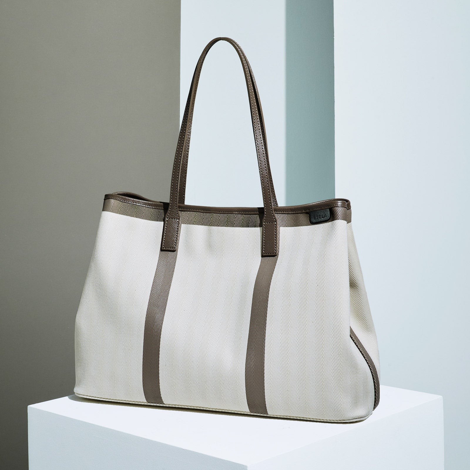 キャンバスバッグ特有の軽快感。またシルクスクリーンプリントとレザーのコンビネーションがあることで、現代的でエレガントな印象を作り上げているラージトートバッグ。